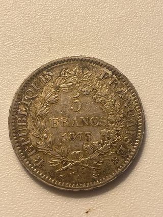 Moneda de 5 francos de Francia, acuñada en el año 1875. Presenta un diseño clásico con figuras alegóricas. - Diseño: Liberté, Égalité, Fraternité - Año: 1875 - Denominación: 5 Francos