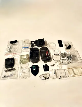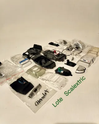 Lote de piezas surtido Scalextric. Bandeja Porsche 917 con casco integral, cristal Lancia 037, cristal Ford Sierra, cristal Ford Mondeo, parachoques Chevrolet Corvette....y otras muchas piezas que no identifico.