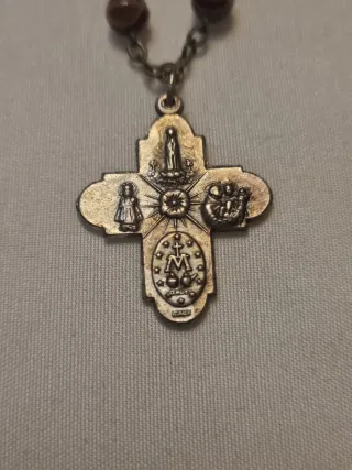 Lote de dos rosarios antiguos de bolsillo, completos y en buen estado. Ambos rosarios cuentan con cuentas de vidrio marmolado antiguo, con vetas internas en tonos marrón y crema, y cruces devocionales macizas en metal blanco, con rica iconografía religiosa en relieve. Las cruces presentan escenas marianas y cristianas clásicas (Virgen, Sagrado Corazón, Niño Jesús, Espíritu Santo), con pátina de época. Piezas antiguas, no modernas, probablemente de mediados del siglo XX (años 50–70). No son de plata. Ideales para colección, devoción personal o regalo religioso. Se venden juntas como lote. Hago envios por Wallapop opcion correos no IM