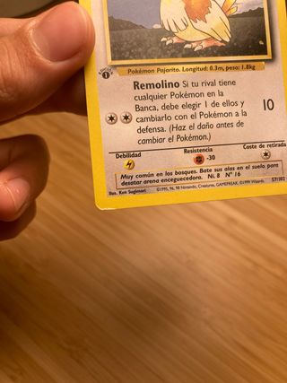Carta Pokémon de Pidgey, edición básica. - Ataque: Remolino. - Debilidad: Rayo. - Resistencia: Lucha. - Coste de retirada: Incoloro. - Ilustrador: Ken Sugimori. - Número de carta: 57/102.