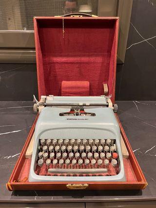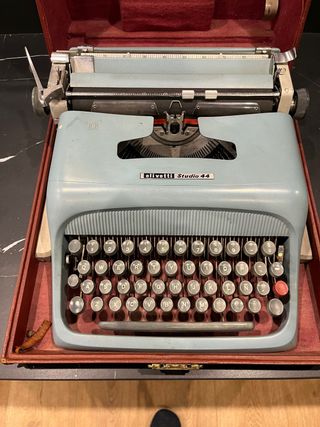 Máquina de escribir Olivetti Studio 44 en su maletín. - Diseño clásico y funcional. - Color azul claro. - Incluye maletín de transporte.