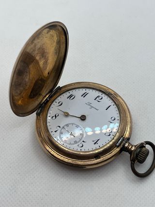 Reloj de bolsillo Longines en tono dorado, ideal para proyectos de restauración. El volante baila pero no se puede cargar, falta una aguja pero la esfera esta inpoluta, va con mecanismo de abertura con boton. El reloj es de 1912 - Caja dorada. - Esfera blanca con números arábigos. - Subesfera para los segundos.