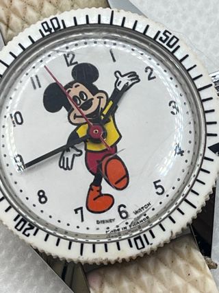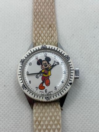 Vendo precioso y raro reloj vintage de Mickey Mouse, modelo estilo "Diver" (buceo), fabricado en Francia por la marca Avronel. Una pieza de colección oficial de Disney Productions. Características: • Marca: Avronel / Walt Disney Productions. • Origen: Made in France (marcado en esfera, tapa y correa). • Movimiento: Mecánico de cuerda manual (no necesita pilas). • Diseño: Esfera con Mickey Mouse a color (brazos como agujas), bisel rotatorio blanco estilo deportivo. • Correa: Original de la época, marcada "ALASKA" y "Made in France". Estilo Tropic de goma blanca, muy buscada. • Tamaño: Diámetro aprox. 30-32mm (tamaño cadete/unisex).