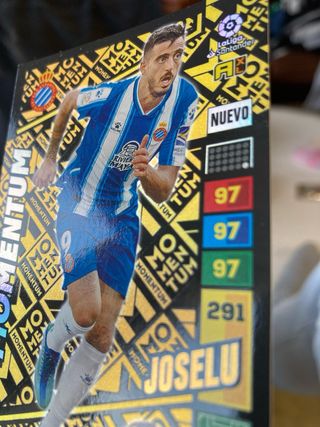 Carta de coleccionista del futbolista Joselu de la colección Momentum de Panini. - Edición LaLiga Santander. - Incluye estadísticas del jugador. - Diseño llamativo con fondo amarillo y negro.