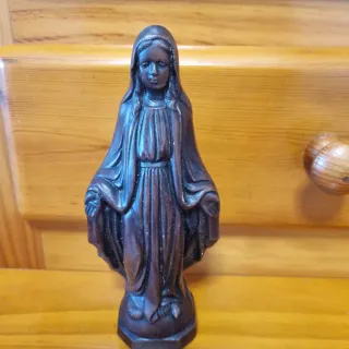 .Imagen antigua de la Virgen de la Medalla Milagrosa, realizada en resina fenólica (tipo bakelita), material muy utilizado en imágenes religiosas de calidad entre los años 1930 y 1950. Figura de gran presencia y peso, con bonito acabado oscuro imitando madera, típica de altares domésticos y capillas. Rostro sereno, pliegues profundos y modelado fino, propio de las piezas devocionales antiguas europeas. 📏 Altura aproximada: 27–28 cm ⚖ Muy pesada para su tamaño (no es plástico ni resina moderna) 🕰 Época: mediados del siglo XX ✝ Iconografía: Virgen Milagrosa (manos abiertas) Con signos normales del paso del tiempo, sin roturas.