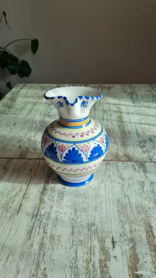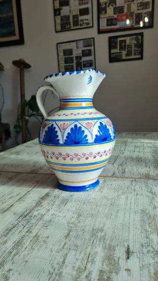 Hermosa Jarra de cerámica artesanal de Talavera de la Reina. Presenta un diseño tradicional. Pintada a mano en tonos azules y blanco con motivos florales y geométricos. Asa y borde decorados. Piezas vintage de colección firmada en su base Cómo nueva En perfecto estado Más modelos en mi perfil Medidas Altura 26cem. Circunferencia 57cem. Basé 10cem. Boca 14cem. Ideal para decorar cualquier espacio de tú hogar o cómo regalo original. Perfecta para coleccionistas Sé hacen lotes al gusto y necesidades con cualquiera de los artículos de mi perfil