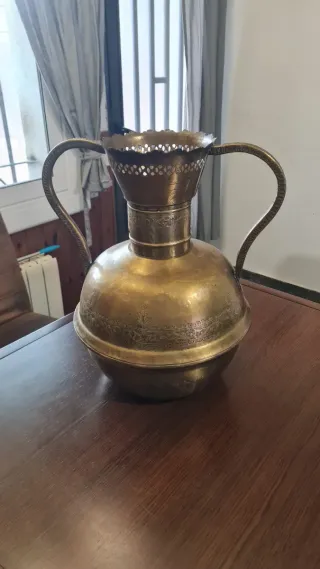 Hermoso jarrón de latón con un diseño de Ánfora Fabricación artesanal martillado con detalles decorativos en relieve y dos asas Acabado en tono dorado Pieza vintage de los años 60/70. En perfectas condiciones teniendo en cuenta su antigüedad Más modelos en mi perfil Medidas Altura 47cem. Circunferencia 96cem. Base 18cem. Boca 18cem. Ideal para decorar cualquier espacio de tú hogar o cómo regalo original. Perfecto para coleccionistas También para anticuarios Sé hacen lotes al gusto y necesidades con cualquiera de los artículos de mi perfil