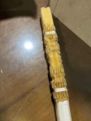 Vela larga de cera natural con talla artesanal en relieve, realizada en año 1970. Decoración floral y geométrica trabajada a mano, típica de velas ceremoniales de altar o iglesia. Pieza espectacular por su tamaño (60 cm de alto) y por su trabajo artesanal. Ideal para: • Decoración vintage • Altares, belenes y espacios espirituales • Escaparatismo • Colección o atrezzo Conserva una preciosa pátina del tiempo y el tono cálido de la cera envejecida. Se vende como objeto decorativo.