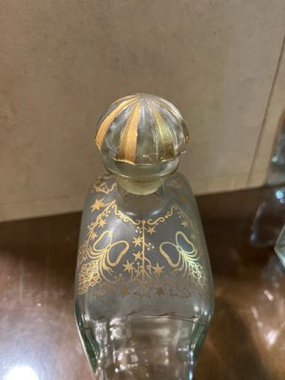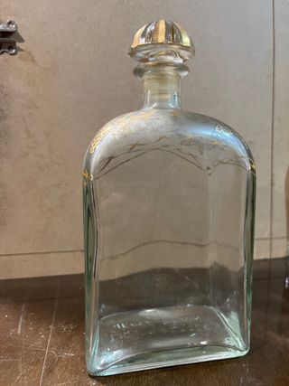 Botella antigua de cristal transparente con decoración dorada en el cuello y tapón original tallado, de estilo clásico y elegante. Diseño muy decorativo, ideal para reutilizar como licorera, botella de perfume, jarrón o pieza decorativa. La decoración dorada presenta el desgaste natural del tiempo, lo que le da un auténtico aire vintage. Perfecta para: • Decoración clásica o retro • Bares, bodegas o tocadores • Atrezzo y escaparatismo