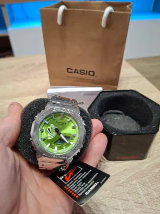 Reloj Casio G-Shock con llamativo dial verde y acabado metálico. - Correa de eslabones de acero inoxidable. - Bisel octogonal. - Resistencia al agua de 20 BAR. NUEVO