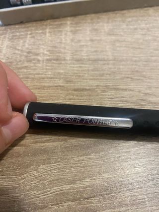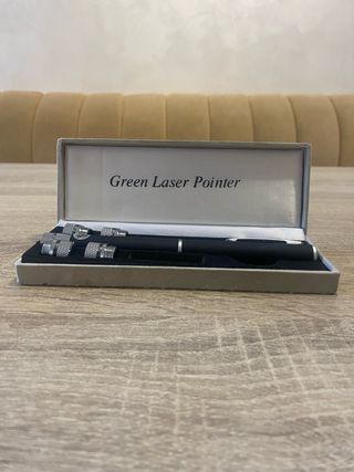 Puntero láser de color verde, presentado en su caja original. - Incluye varios cabezales o accesorios. - Diseño elegante y compacto.