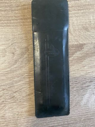 Funda de piel negra para regla Faber Castell. Presenta un diseño elegante con el logo de la marca grabado. - Material: Piel. - Color: Negro. - Marca: Faber Castell.