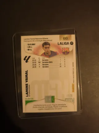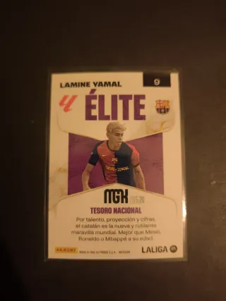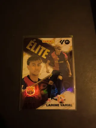 Carta coleccionable de Lamine Yamal de la colección Élite 2025/26 de Panini. - Diseño Élite. - Incluye logo de Panini y EA Sports. - Imagen de Lamine Yamal con el escudo del FC Barcelona.