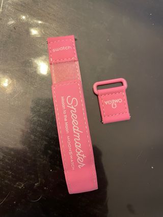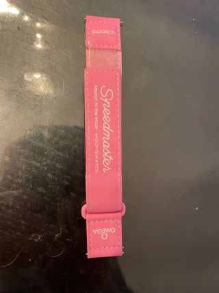Correa de repuesto para el modelo Speedmaster de la colaboración entre Swatch y Omega. - Color rosa vibrante. - Logo de Swatch en la parte superior. - Logo de Omega en la parte inferior. - Diseño Mission to the Moon Moonswatch.