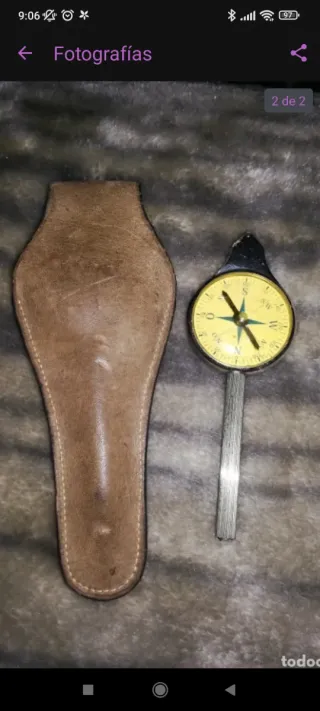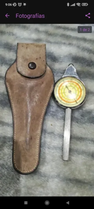 Conjunto de curvímetro y brújula de época, con una funda de cuero. - Curvímetro con esfera circular y aguja indicadora. - Brújula integrada en la esfera. - Funda de cuero con cierre de botón.