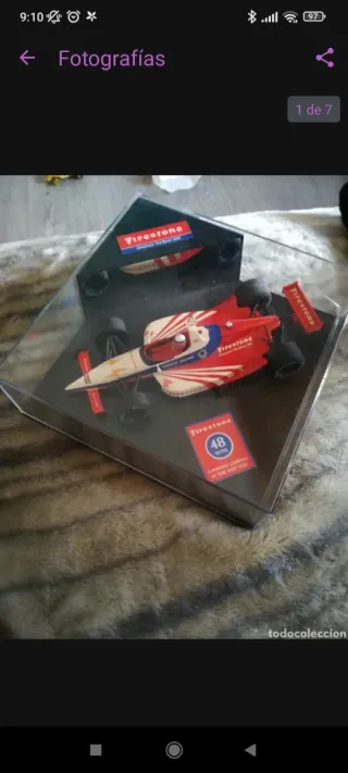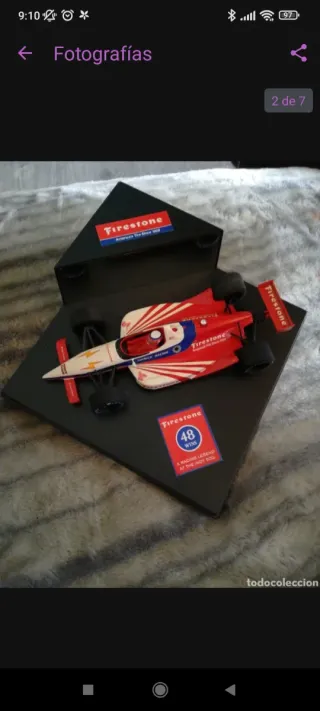 Réplica de coche de carreras Firestone. - Presentado en su caja expositora de plástico. - Diseño rojo, blanco y azul. - Detalle de 48 WINS y A Racing Legend at the Indy 500.