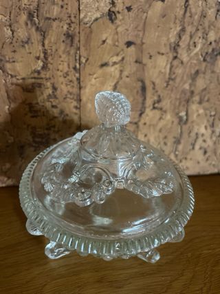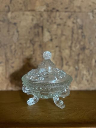 Vendo preciosa bombonera o tarro para dulces vintage de vidrio prensado transparente (años 40-60 aprox., estilo Depression Glass). Tapa con pomo en forma de racimo de uvas y relieves de hojas/uvas alrededor, base redonda con borde festoneado y patas curvadas tipo león (lion paws). Detalles moldeados finos: bordes acanalados, hojas entrelazadas, todo brillante y elegante. Perfecta para dulces, joyas, decoración mesa romántica o vitrina retro. Estado: excelente – sin roturas, sin grietas, cristal claro y brillante.