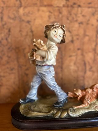 Vendo figurita de porcelana esmaltada vintage, escena divertida: niño corriendo sonriente mientras el perro le tira juguetón de la pernera del pantalón. Detalles realistas en caras, ropa y pelaje. Base oval con relieve + peana madera oscura. Altura: 22 cm; base: 25 cm largo (pieza grande y decorativa). Estado: excelente, sin roturas, grietas, faltas ni descorche; colores vivos y brillo intacto. Estilo Lladró o similar (sin marca visible), perfecta para colección, salón, deco cozy o regalo.