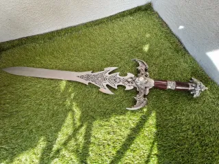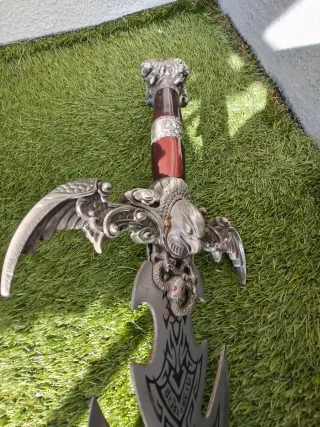 Espada de colección con un diseño intrincado y detalles ornamentales. - Hoja de metal con grabados. - Empuñadura detallada con motivos de dragón y acabado en madera. - Guarda elaborada con figuras. - Pieza decorativa para coleccionistas.