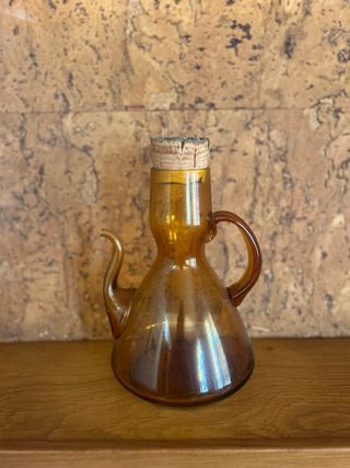 Bonito decantador vintage de vidrio soplado en tono ámbar cálido (marrón dorado translúcido). Forma elegante tipo garrafa con base ancha, cuello estrecho, asa curva integrada y pico vertedor largo curvado. Incluye tapón de corcho natural original (con algo de uso/edad típico vintage). Altura: 27 cm. Ideal para servir licores, vinos, aceites o como pieza decorativa rústica/shabby chic/mid-century en cocina, salón o bar. Buen estado: vidrio sin grietas ni roturas, solo el corcho muestra patina natural.