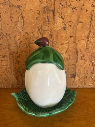 Pieza vintage super mona para cocina o decoración! Tarro en forma de berenjena de cerámica blanca esmaltada, con tapa verde hoja grande y botón morado (tallo), más plato base en forma de hoja verde texturizada. Ideal como azucarero, mermeladera, tarro especias o simplemente decorativo shabby chic/country/vegetal. Buen estado vintage: sin roturas ni grietas visibles, esmaltado perfecto