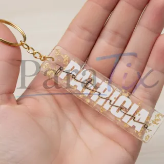 Llavero acrílico con nombre en vinilo y resina UV. Hecho a mano para durar. Tamaño: 8x1,5 cm rectangular transparente. (Medidas aproximadas). Materiales: Acrílico + vinilo blanco y negro + resina + pan de oro + metal. Personaliza: Nombre. Ideal: Parejas, aniversarios, detalles.