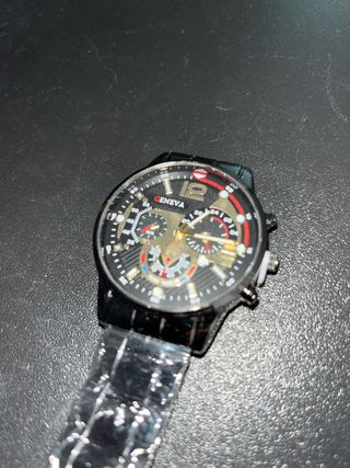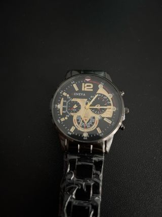 Elegante reloj de pulsera Geneva con un diseño moderno. - Esfera negra con detalles dorados. - Correa metálica plateada. - Diseño tipo cronógrafo.