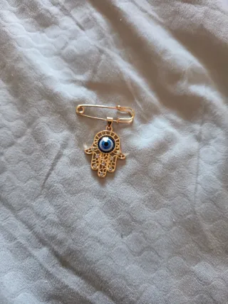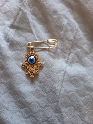 Este alfiler decorativo presenta un diseño de mano de Fátima (Hamsa) con un ojo turco en el centro. Está adornado con pequeñas piedras brillantes. - Diseño de mano de Fátima. - Ojo turco central. - Detalles con pedrería.