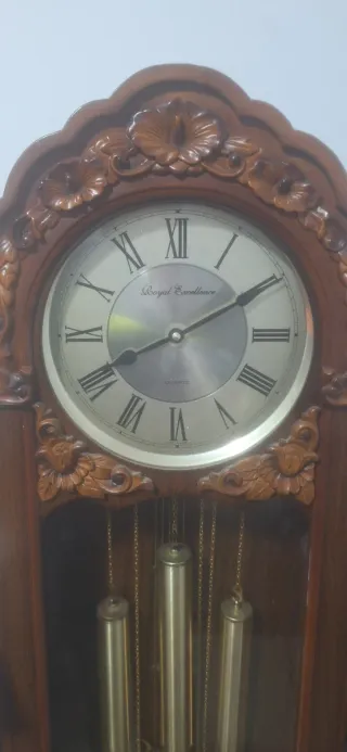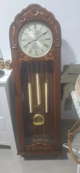 Funciona perfectamente y sonidos este Elegante reloj de pie de estilo vintage de la marca Royal Excellence. Su diseño clásico y sus detalles tallados lo convierten en una pieza decorativa para colecionismo.medidas 1.40 altura.y anchura 39cms - Mecanismo de péndulo y pesas. - Esfera con números romanos. - Acabado en madera oscura.