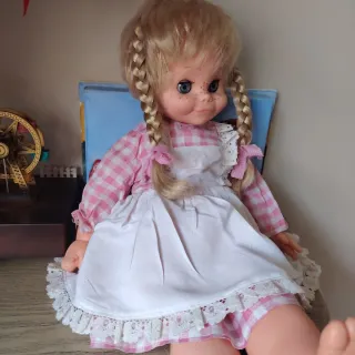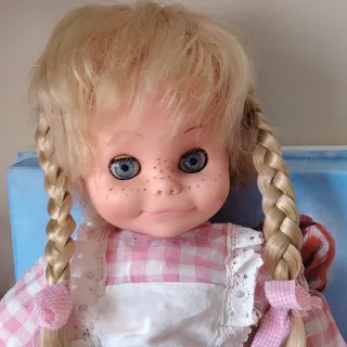 Muñeca habladora de la marca Antonio Juan. Es una muñeca de vinilo con pelo rubio y ojos azules. Aprietas su barriga y dice , mama, papa , rie . Se oye muy bien