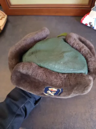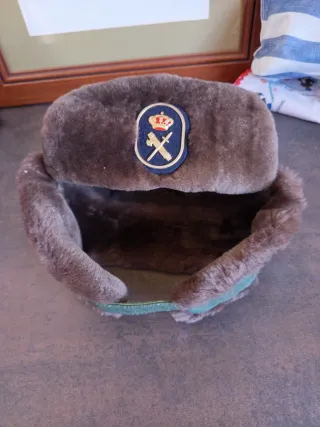 Gorro de estilo Ushanka, oficial de la Guardia Civil destacamento en Rumanía. Diseñado para ofrecer calidez y protección. - Exterior en piel verde - Insignia oficial de la Guardia Civil. - Material exterior de pelo marrón. - Forro interior y ribete de tela verde.
