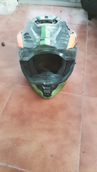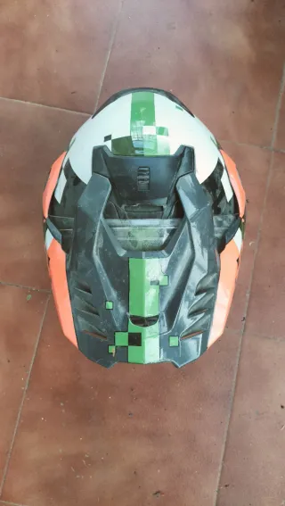 Casco de moto con diseño moderno y soporte para cámara. - Buen estado de conservación. - Ideal para motocross o deportes de aventura.