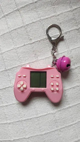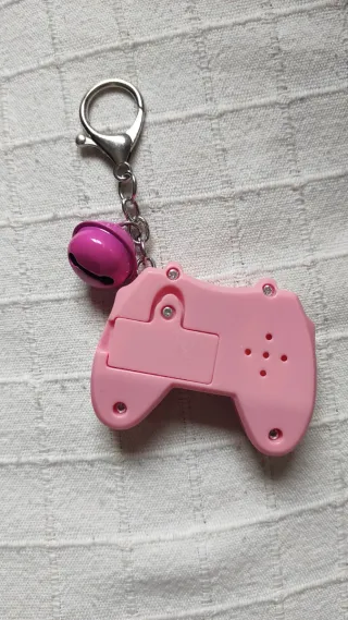 Este llavero tiene la forma de una mini consola de videojuegos en color rosa. - Incluye un pequeño cascabel rosa. - Tiene botones y una pantalla. - Cuenta con un aro para colgarlo.