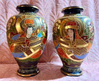 endo pareja de jarrones grandes estilo Satsuma con rica decoración oriental en relieve y detalles en dorado. Altura: 33 cm cada uno. En muy buen estado, sin golpes ni grietas. Presentan leve craquelado en la base acorde a la antigüedad. Decoración muy detallada con figuras tradicionales y abundantes acabados en oro. Son piezas decorativas muy elegantes que lucen especialmente bien colocadas en pareja, enfrentadas. Ideales para salón, recibidor o decoración clásica con toques dorados. Se venden juntos.