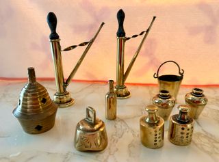 Lote de piezas decorativas antiguas en latón. Incluye varios objetos pequeños vintage en buen estado, ideales para decoración rústica, clásica o estilo retro. Perfecto para dar carácter a un salón, estantería o casa de campo. Algunas piezas son más decorativas y otras funcionales antiguamente. Se vende el conjunto completo. Precio ajustado para venta rápida.