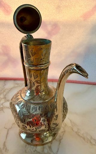 Bonita jarra decorativa de latón grabado, hecha en India (marcada en la base). Totalmente funcional – no pierde líquido. Ideal como pieza decorativa, para aceite, flores secas o como elemento vintage en cocina o salón. 📏 Medidas: – Altura: 15 cm – Ancho aprox.: 11 cm En buen estado general, con pequeñas señales normales del paso del tiempo. Se puede ver sin compromiso.