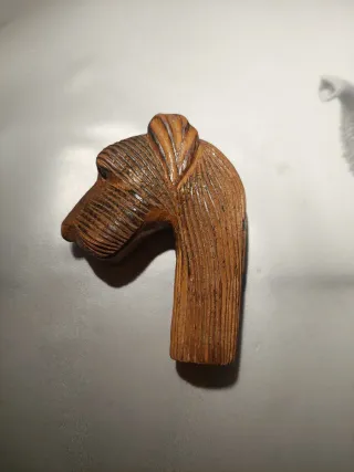 Este es un antiguo mango de bastón tallado en madera con la forma de una cabeza de perro. Con detalles en los ojos - Material: Madera. - Diseño: Cabeza de perro. - Estilo: Antiguo.