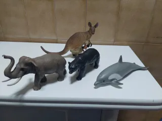 Conjunto de figuras de animales de la marca Schleich. NO SE HACEN ENTREGAS EN PERSONA - Incluye elefante, oso, delfín y canguro con cría. - Figuras detalladas y realistas.