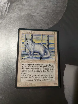 Carta de Magic: The Gathering, Zorros Árticos. NO SE HACEN ENTREGAS EN PERSONA - Ilustración de Mark Poole. - Publicada en 1996. - Texto de ambientación: Esos Zorros son astutos, rápidos y feroces. Son los guerreros de las nieves.» General Jarkeld, el Zorro Artico. - Coste de maná: 1 genérico y 1 blanco. - Habilidad: Si el jugador defensor controla alguna tierra nevada, ninguna criatura de fuerza superior a 1 puede asignarse para bloquear a los Zorros árticos.