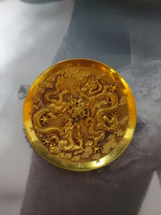 Placa decorativa de bronce antiguo con un diseño de doble dragón en dorado. Diámetro: 98 mm Material: Está hecho de cobre y tiene un acabado chapado en oro para dar un efecto dorado. Diseño: Presenta dragones en relieve detallados y, en el centro, el carácter chino "福" (fú), que significa "bendición" o "buena fortuna". Simbolismo: En la cultura china, los dragones son símbolos de gran poder, fuerza y buena suerte, a menudo asociados con el emperador. El color dorado simboliza la riqueza y el éxito. Cuando se emparejan (doble dragón), a menudo representan la felicidad matrimonial y la armonía