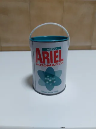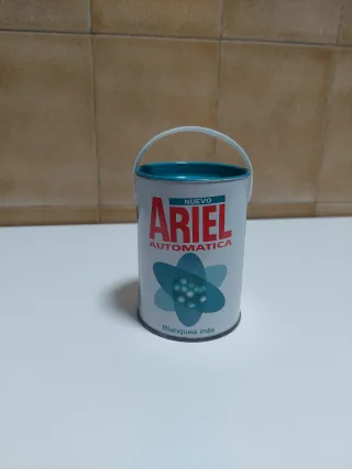 Hucha con forma de tambor de detergente Ariel. - Diseño inspirado en el envase de Ariel. - Fabricada entre 1977 y 2002.