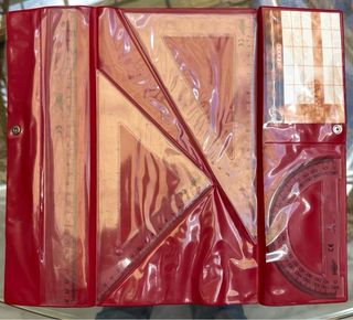 Set de reglas de plástico en color rojo. Incluye una regla principal y un bolsillo lateral. - Material: Plástico. - Color: Rojo. - Cierre: Botón a presión.