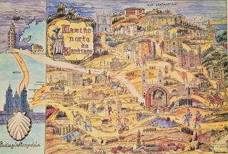 3 Mapas ilustrados del Camino de Santiago. - Representación detallada de la ruta. - Incluye puntos de interés y monumentos. - Estilo de ilustración vintage.