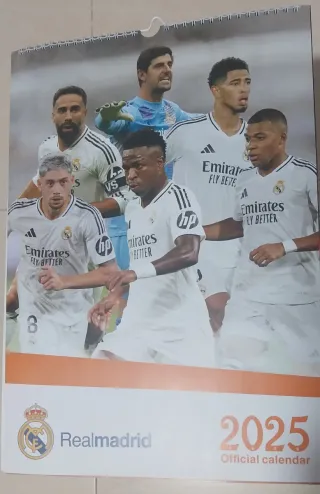 Calendario oficial del Real Madrid para el año 2025. Presenta una imagen grupal de los jugadores del equipo. - Incluye el escudo del Real Madrid. - Diseño con el año 2025 y la leyenda Official calendar.