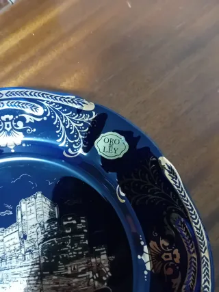 Plato decorativo de porcelana española Porcelanas 2000, con decoración en oro de ley aplicado y motivo del Castillo de la Mota (Medina del Campo, Valladolid). - Color azul cobalto con detalles dorados - Oro auténtico aplicado (uso decorativo) - Fabricado en España - Diámetro: 20,5 cm - Incluye soporte para exposición - Muy buen estado, sin golpes ni grietas Ideal para coleccionistas, decoración clásica o como recuerdo histórico.