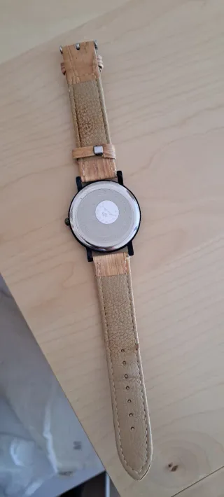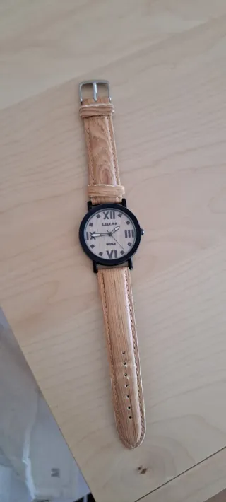Reloj con correa y esfera que imitan la madera. - Correa de imitación madera. - Esfera con números romanos.