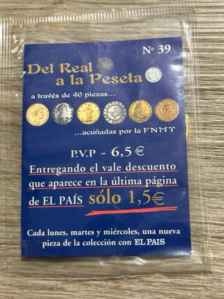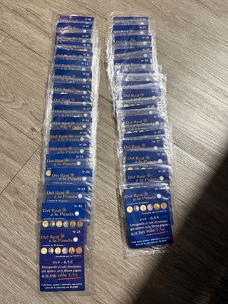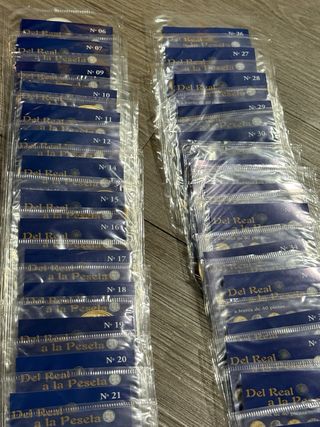 Vendo lote de fascículos de la colección “Del Real a la Peseta”, editada por El País, dedicada a la historia de la moneda española. 🔹 Estado: nuevos, sin abrir, en su envoltorio original 🔹 Números disponibles: disponibles 6,7,9,10,11,12,14,15,16,17,18,19,20,21,22,23,24,25,26,27,28,29,30,31,32,33,34,35,36,37,38,39,40 (ver foto) 🔹 Ideal para: coleccionistas, numismática, para completar colección o regalo 🔹 Con monedas acuñadas por la FNMT (según la colección) 📦 Se vende el lote completo (consultar si interesa por separado). 📸 Artículos exactamente los de las fotografías. 🤝 Entrega en mano o envío