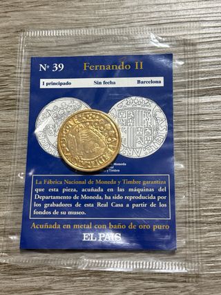 Réplica de moneda de Fernando II, número 39, acuñada en metal con baño de oro puro. - Réplica de 1 principado. - Sin fecha. - Acuñada en Barcelona. - Reproducción de la Fábrica Nacional de Moneda y Timbre.