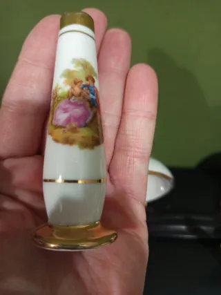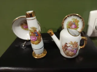 Conjunto de miniaturas de porcelana con delicados diseños. - Piezas decoradas con escenas románticas. - Acabados dorados en bordes y detalles. - Incluye una regadera y un jarrón. Regalo cajita decorativa, ideal para regalo