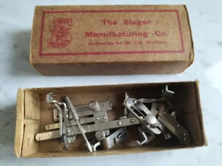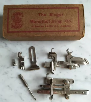 Accesorio antiguo para máquinas de coser Singer. Prensatelas para punto zig-zag y para hacer ojales. Apto para maquina de coser Singer vintage de caña baja modelos 15, 27, 28, 66, 99, 99k, 101, 127, 128, 185, 201, y Featherweight 221 y 222. Artículo de colección. Escaso, raro, difícil de encontrar completo! Pago PAYPAL AMIGO Envío por Correos 📨 a cargo del comprador